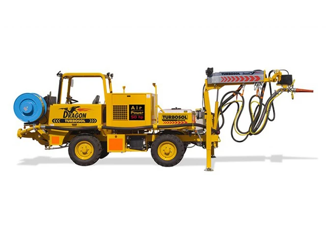 Turbosol Dragon er en maskin for å sprøyte underjordisk Dragon har 4-hjuls drift og krabbegir.